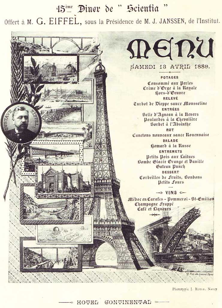 achèvement cette année-là de la Tour Eiffel. Après les entrées, un Sorbet à l’Absinthe était servi en guise de Trou