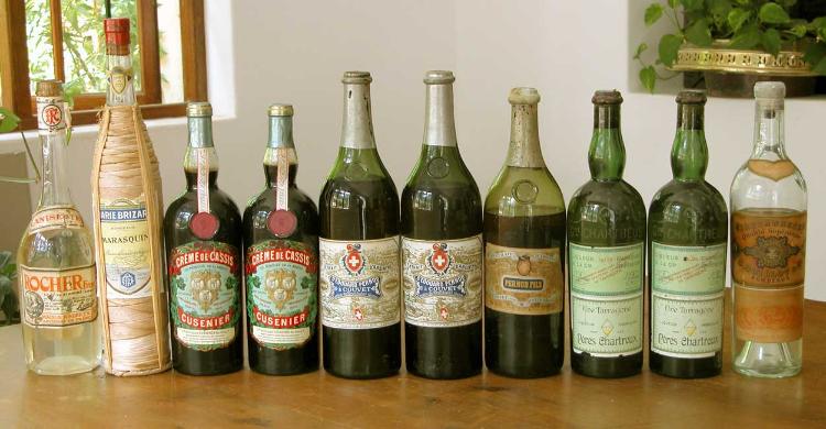 Colelction d'anciennes bouteilles d'absinthe, certaines encore scellées et remplies de leur contenu original.